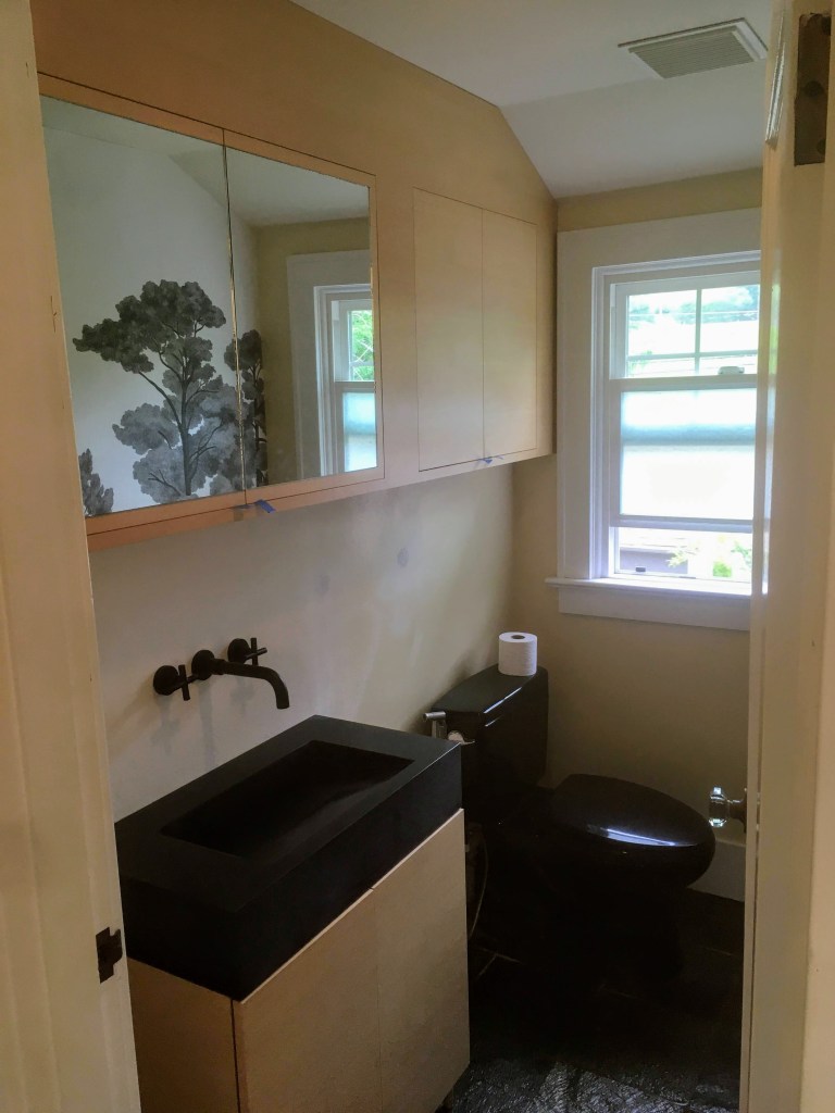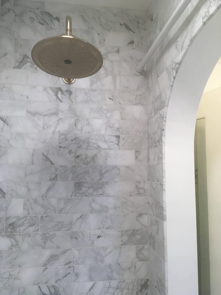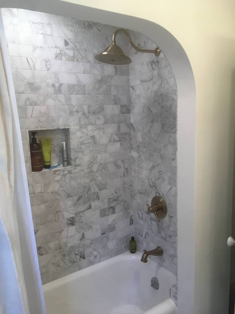 Modern look with black concrete trough sinkMarble subway tile with arched alcoveCustom vanity with marble top for this remodelMarble shower tile with champagne bronze trim